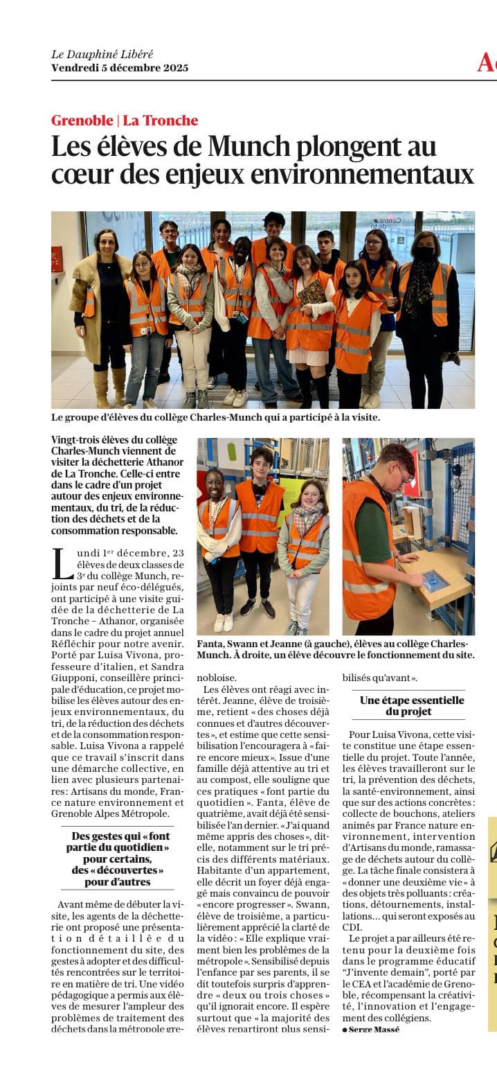 Article de presse "les élèves de Munch plongent au coeur des enjeux environnement" La Dauphiné Libéré